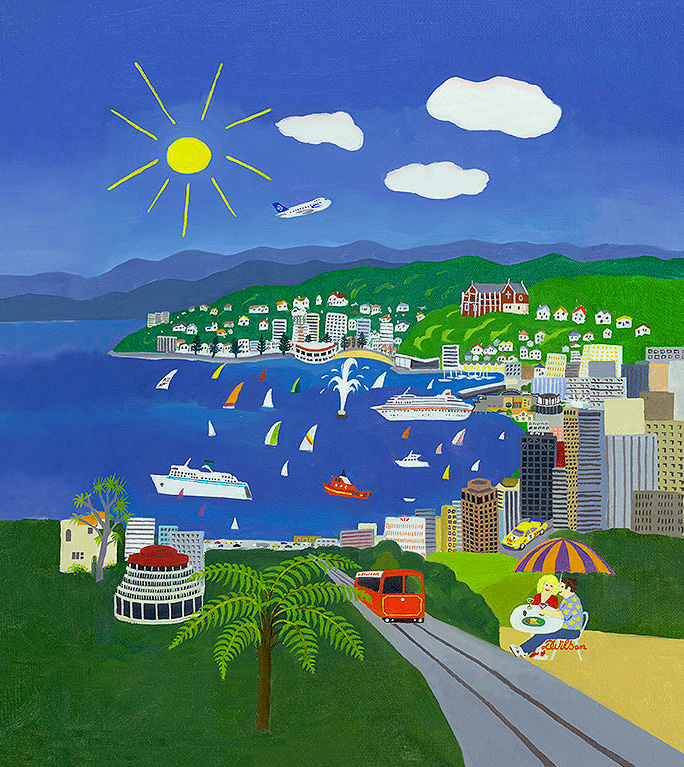 I thought I’d go against type and do this naive depiction of Wellington. I had fun doing it and hope that’s conveyed. This was nearly a Wellington telephone book cover and won a Telecom award.